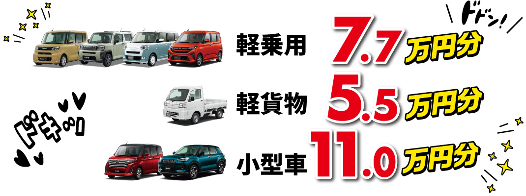 ■同期間に実施している「限定車」などの施策との併用はいたしかねます。■2025年10月1日~2026年1月31日までに、新車の軽乗用車と用品77,000円(消費税込み)分、軽貨物と用品55,000円(消費税込み)分、小型車と用品110,000円(消費税込み)分をセットでご成約の上、2026年2月末日までに届出いただくことを条件に軽乗用は77,000円(消費税込み)、軽貨物は55,000円(消費税込み)、小型車は110,000円(消費税込み)を割引いたします。■新車と同時にご注文いただいた用品の金額が軽乗用77,000円(消費税込み)、軽貨物55,000円(消費税込み)、小型車110,000円(消費税込み)に満たない場合は対象外となります。■既に成約済みの車両にさかのぼって適用することはできません。 ■販売会社によって、期間・内容・条件・対象用品が異なる場合がございます。■一部の店舗では実施していない場合がございます。■営業日は店舗によって異なります。■詳しくは販売会社スタッフへお問い合わせください。■掲載情報は、2025年10月1日時点のものとなります。
