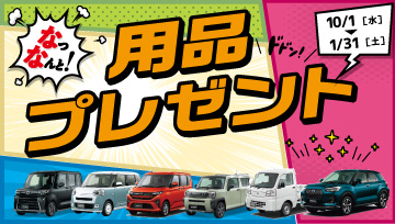 10月1日(水)~1月31日(土)まで「用品プレゼントキャンペーン」を開催。対象車種の新車をご成約のお客様に用品をプレゼント!