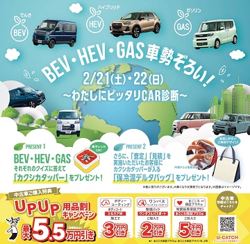 BEV車(でんき)・HEV車(ハイブリッド)・GAS車(ガソリン)それぞれのクイズに答えて「カクシカタッパー」プレゼント!
